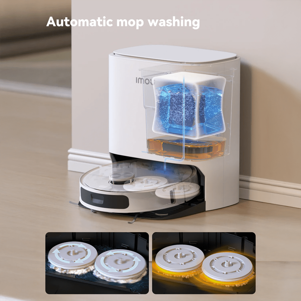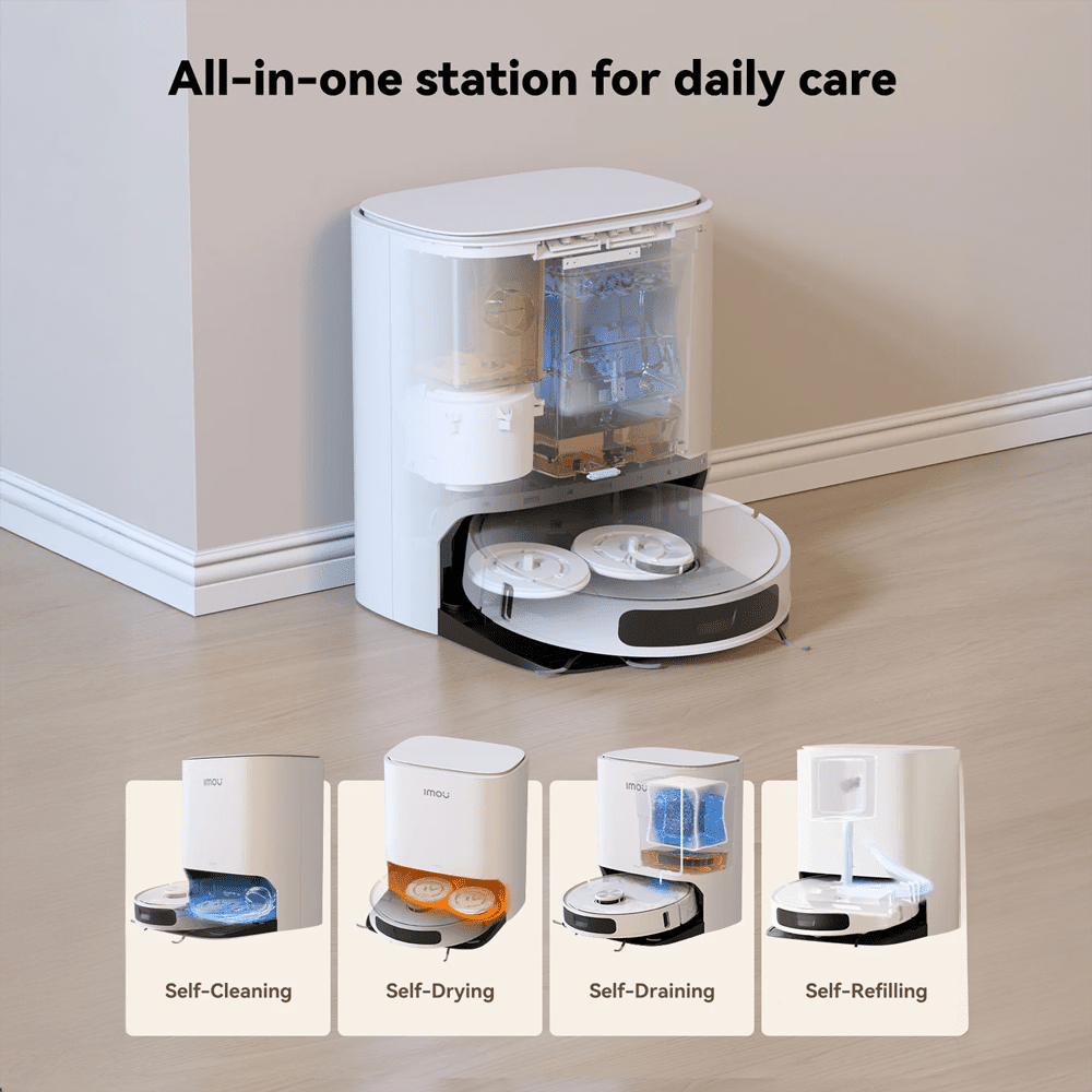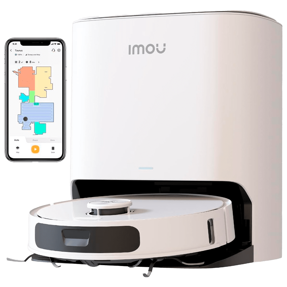 De Imou RV3 stofzuigt en dweilt jouw vloeren zelfstandig en grondig als jij niet thuis bent. Dankzij het uitgebreide reinigingsstation spring je zelf bijna niet bij. De robot leegt zijn stofbak, hervult zijn watertank en wast en droogt zijn dweilpads automatisch. De ronddraaiende dweilpads schrobben vlekken gemakkelijk van je vloer. Als de robot langs plinten rijdt, schuift de dweilpad uit. Hierdoor mist hij geen plekken langs de randen. Bij tapijt tilt de dweil automatisch op. Ook verhoogt de robot hier zijn zuigkracht, zodat hij grondiger stofzuigt. De robotstofzuiger heeft een zuigkracht van 8.500 Pascal. Dankzij slimme sensoren brengt de robot jouw huis precies in kaart. Zo rijdt hij netjes om jouw meubels of rondslingerend speelgoed heen. Via de app maak je tot 3 verschillende plattegronden.