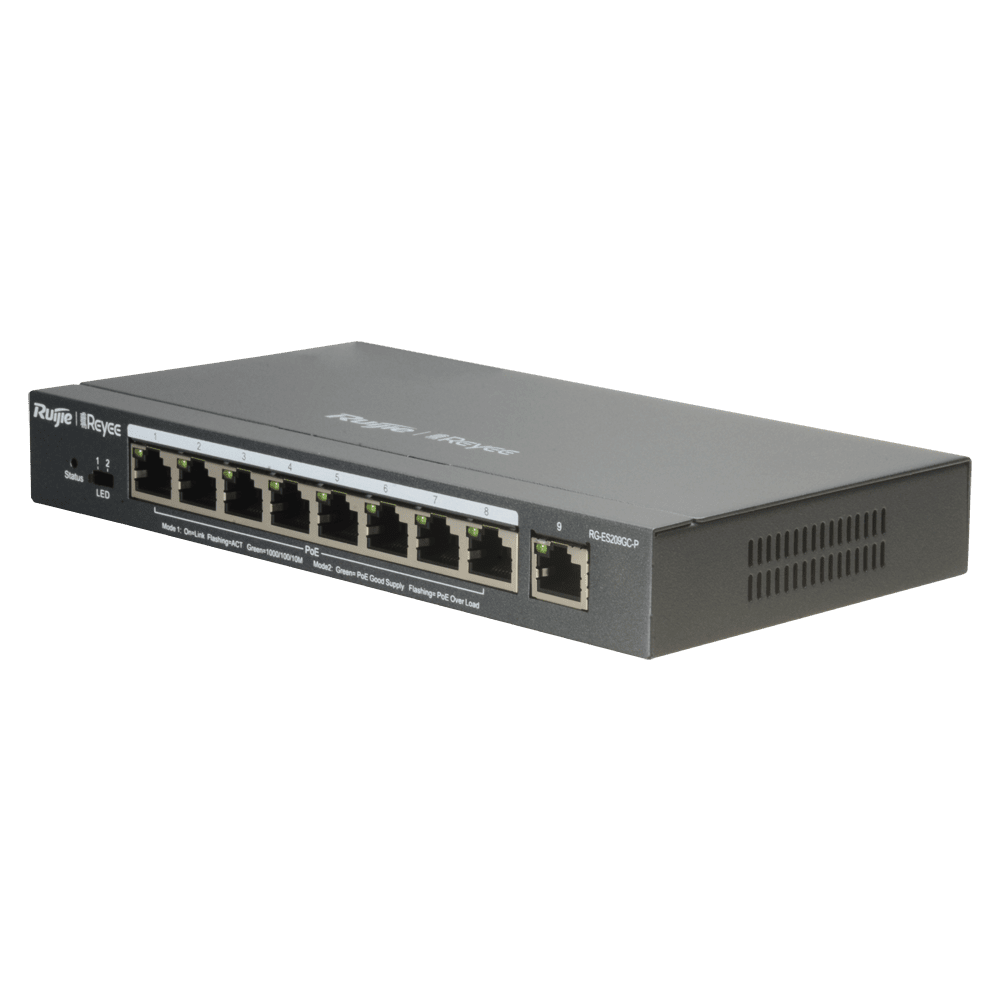 De Reyee RG-ES209GC-P is een slimme en volledig cloud-beheerbare Gigabit PoE-switch met 8 PoE-poorten (802.3af/at) en 1 Gigabit uplink-poort. Elke PoE-poort ondersteunt tot 30W vermogen, met een totaal PoE-budget van 120W, waardoor deze switch ideaal is voor IP-camera’s, VoIP-telefonie of draadloze access points.
